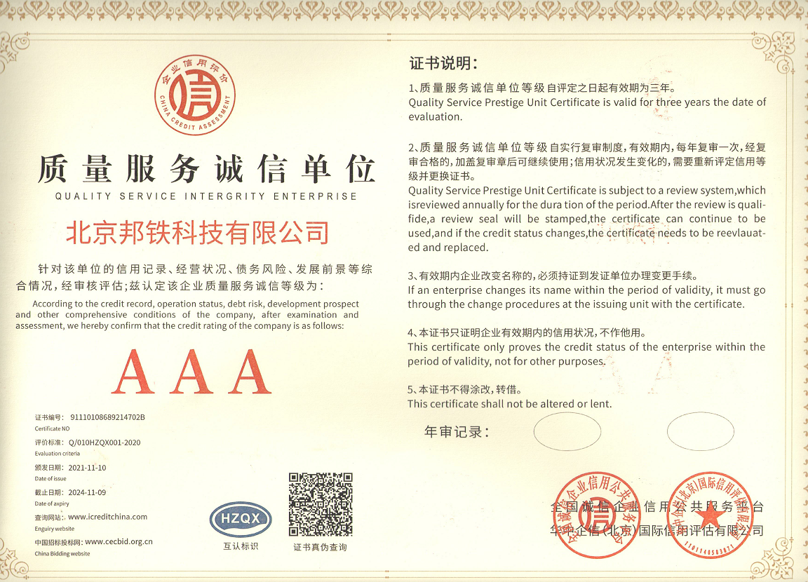 質(zhì)量服務(wù)誠(chéng)信單位-AAA證書(shū)