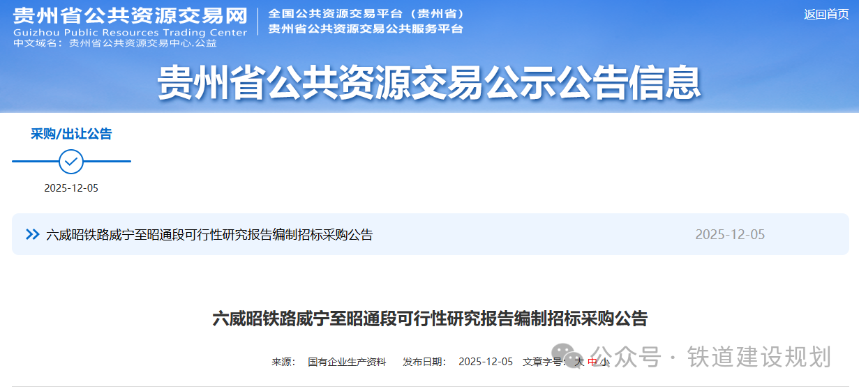 2025/12/0812月5日,六威昭鐵路威寧至昭通段可行性研究報告編制招標采購公告在貴州省公共資源交易網(wǎng)發(fā)布,招標人為貴州鐵路投資集團有限責任公司。根據(jù)公告:六威昭鐵路項目位于貴州省六盤水市、畢節(jié)市、云南省昭通市,線路自貴...